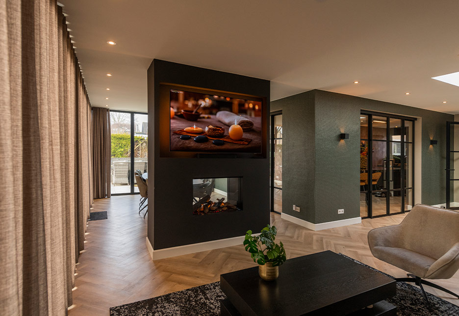 Binnen staat een op maat gemaakte televisiekast met een inbouwhaard op waterstof, een stijlvolle en duurzame blikvanger die perfect past bij het eigentijdse interieur. De pvc-vloer maakt het geheel compleet en zorgt voor een warme, onderhoudsvriendelijke afwerking.