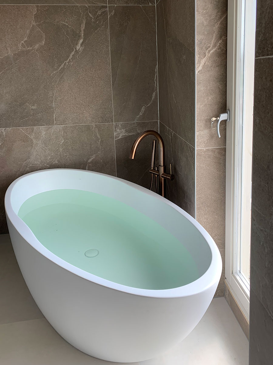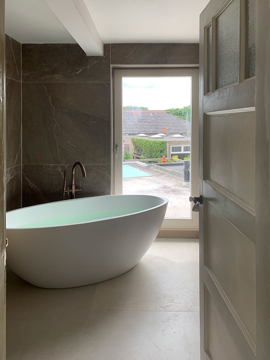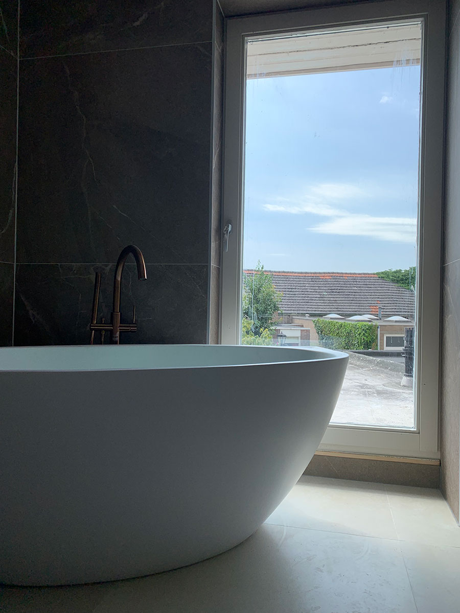 Na het zorgvuldig slopen van de oude badkamer hebben we nieuwe wanden geplaatst om de ruimte te vergroten. De nieuwe badkamer is voorzien van een kozijn met HR++ beglazing, een cementdekvloer met elektrische vloerverwarming en stijlvolle nieuwe tegels. Het vrijstaande bad vormt het middelpunt van de ruimte en geeft de badkamer een moderne, luxe uitstraling.